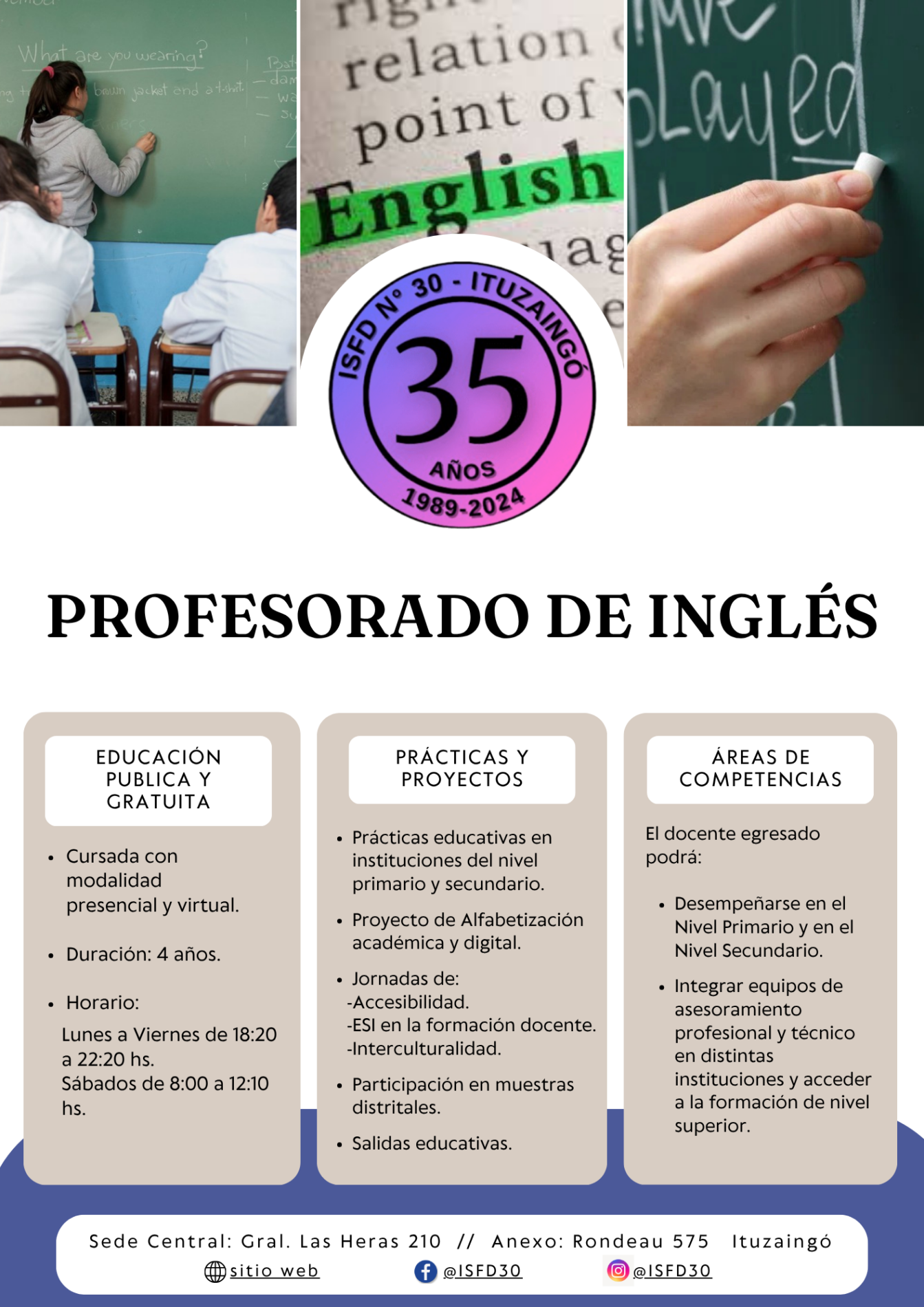 Las/los egresados de la carrera del Profesorado de Inglés puede desempeñarse tanto en el Nivel Primario como en el Nivel Secundario. La duración de la carrera es de 4 años. De acuerdo con el Diseño Curricular, la carrera está dividida en tres Campos de Formación: